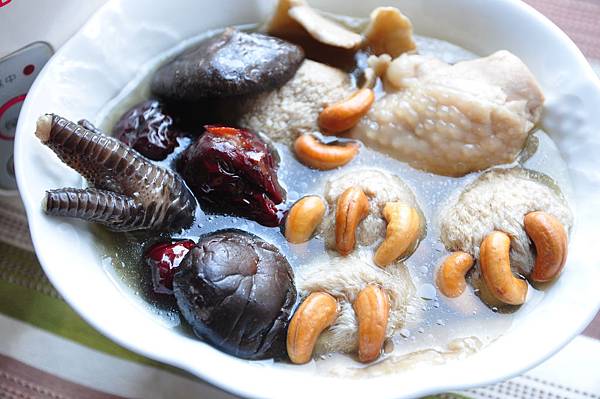 雞腿 1支 、猴頭菇 1盒(約四顆) 、鮑魚菇 3片、乾香菇 3片、大紅棗 3顆、腰果 1小把、鹽巴 適量