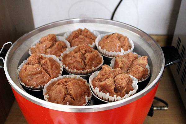 6.取出大同電鍋,外鍋放入2杯水,蓋上蓋子按下電源,待冒出蒸氣後開蓋放入發糕,接著蓋上蓋蒸25分鐘(中途不可開蓋),即完成。
