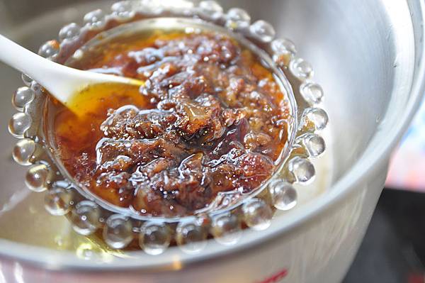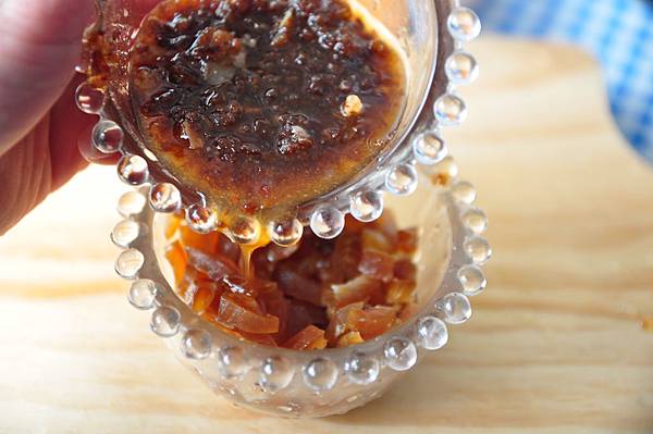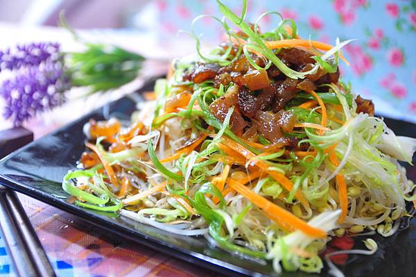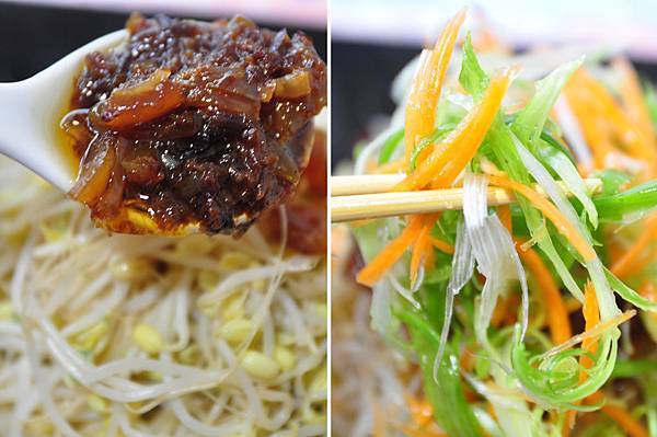 4.先舀一大匙燉好的肉燥醬拌入豆芽菜上,再放上泡過水的蔥絲與紅蘿蔔絲。