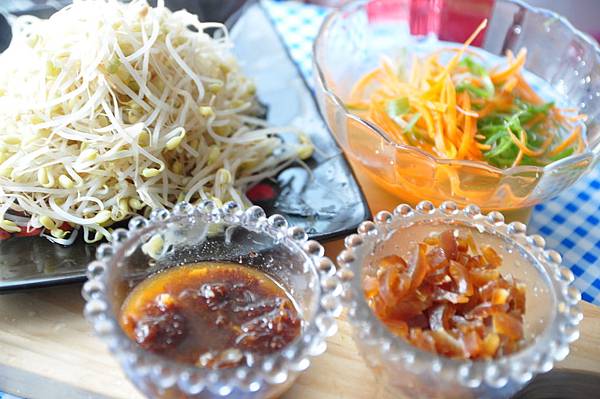 1.備料:先將綠豆芽川燙滾煮後撈起,再將紅蘿蔔、青蔥刨絲泡水(可讓蔥絲捲曲變的更美喔),市售的肉燥醬與滷好的豬皮切細丁。