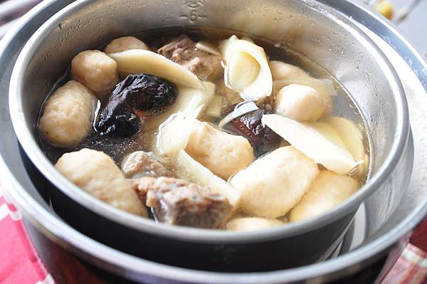 3.將所有的食材放入內鍋中,並加入適量的水份(約7-8分滿的水),並於外鍋倒入3.5杯水(量米杯)按下開關開始燉煮。