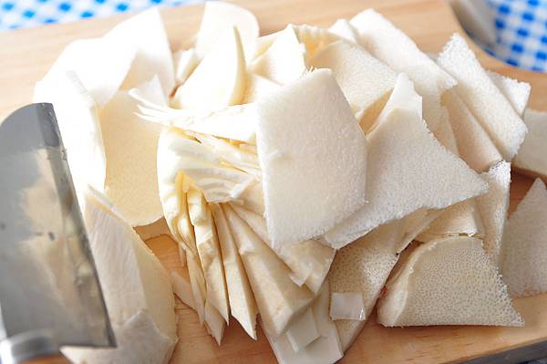 2.竹筍切薄片狀(這樣可以煮的更入味與更快熟透)