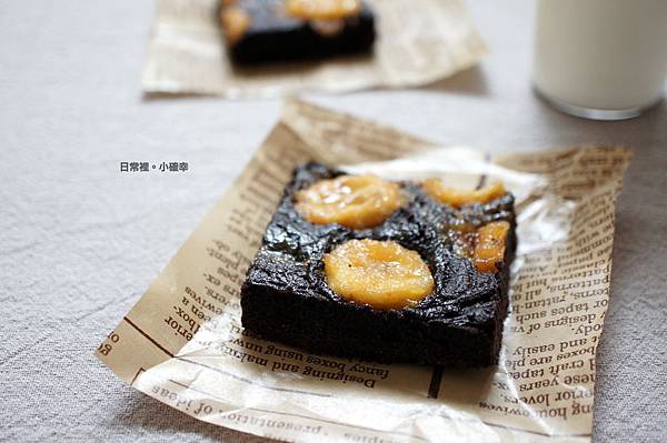 6.烤模鋪上烘培紙,將巧克力麵糊倒入鋪平,擺上焦糖香蕉。