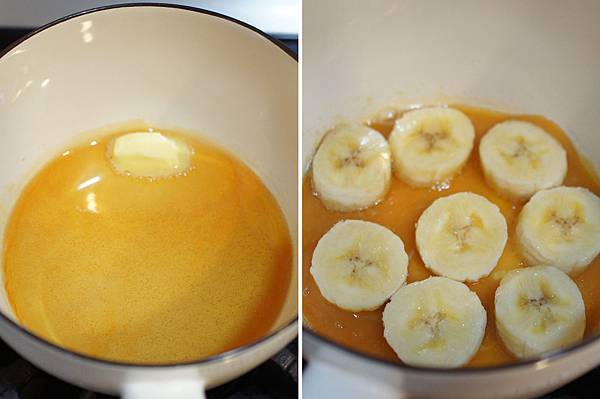 2.加入無鹽奶油攪拌均勻變稠後,再加入香蕉,開小火略煮,讓香蕉均勻裹上焦糖後,熄火備用。