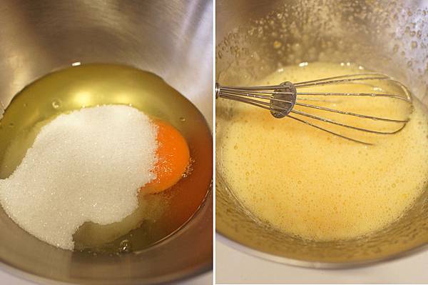 3.鋼盆內放入蛋、細砂糖打散至糖溶解。