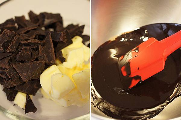 4.利用微波爐(或隔水加熱)將巧克力與奶油溶化並拌勻。