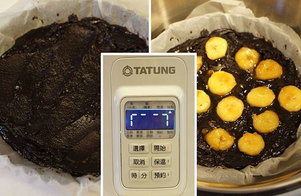 再將烤模放入「大同智慧AI電鍋」中,蓋上蓋子,外鍋無須放水,按選擇鍵選至『糕點』模式,再按下開始鍵,約30分鐘後,焦糖香蕉布朗尼就完成了。