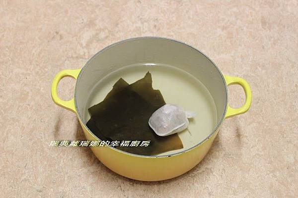 1.製作高湯,將昆布洗淨後泡在清水裡半小時,接著放到爐火上煮滾在加入適量鹽巴即成高湯(喜歡柴魚的也可以加柴魚片,偷懶的作法就是清水+昆布粉)
