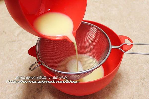 2.將雞蛋與放涼的高湯攪拌均勻後,用濾網過篩到泡沬變小。