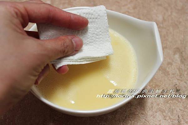 3.後倒入適當的容器中,用廚房紙巾把表面的泡沫吸掉(避免茶碗蒸表面有孔洞)