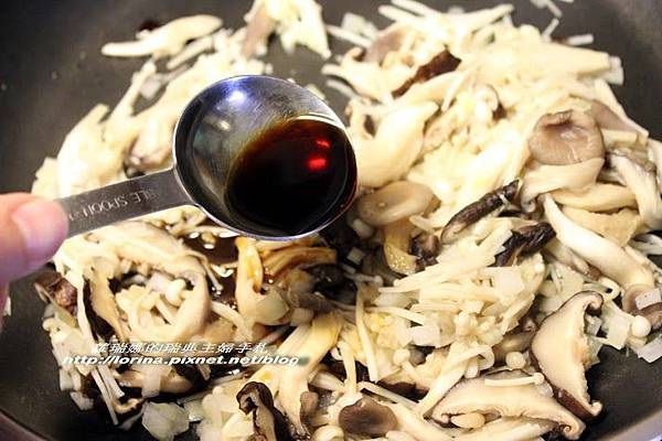 5.蒸蛋的同時來製作﹝鮮菇淋醬﹞,先於鍋中放少許油,炒香洋蔥、蒜末及菇類。