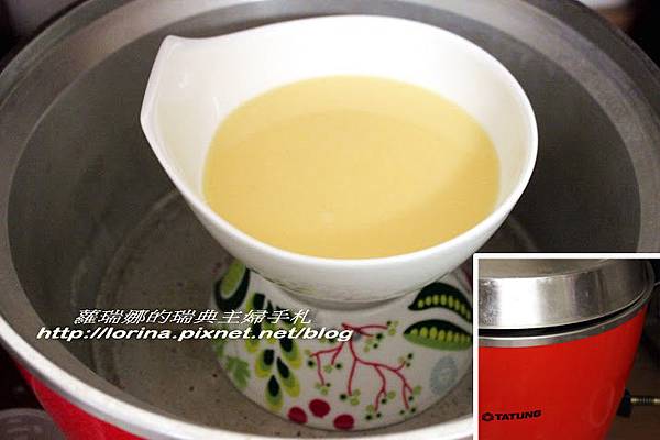 4.接著於大同電鍋中倒放一個碗,再把裝有蛋汁的容器放在上面(避免容器接觸鍋底,否則受熱過高茶碗蒸表面仍會有孔洞);於外鍋倒入一杯水,蓋上鍋蓋(留下一點縫隙),按下電源。