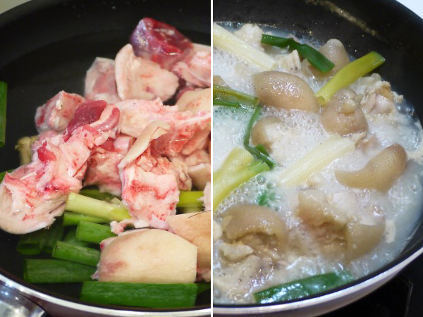 1.取一鍋,放入豬腳、拍碎的薑與切大段的蔥加冷水蓋過所有材料後加熱煮滾約15分鐘。
