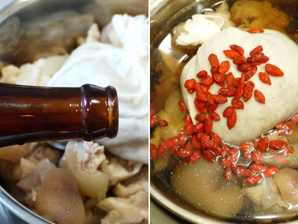 2.之後取出豬腳將表面的髒污洗淨,放入大同電鍋內鍋,再放入中藥材包、枸杞與米酒,加入冷水蓋過材料,蓋上內鍋鍋蓋,外鍋放兩杯水,蓋上外鍋鍋蓋開始燉煮。