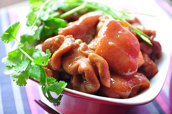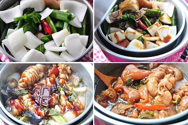 2.豬腳與處理好的大腸放入電鍋內鍋,再加入洋蔥、蒜段、蔥段、辣椒並以醬料調味,外鍋加入400cc水,開始燉煮至電源跳起,接著再放入一塊黑巧克力,並調整自己覺得適合的鹹度斟酌加醬料,再於外鍋加入350cc繼續燉煮第2次至完成。