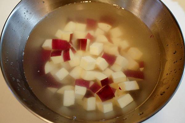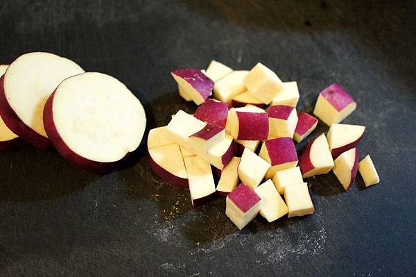 1. 栗子地瓜洗淨,不削皮,切小塊(約1公分X1公分),泡水