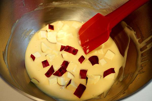 6. 泡過水的栗子地瓜,將水分瀝乾,保留1/3備用,其他拌入麵糊中