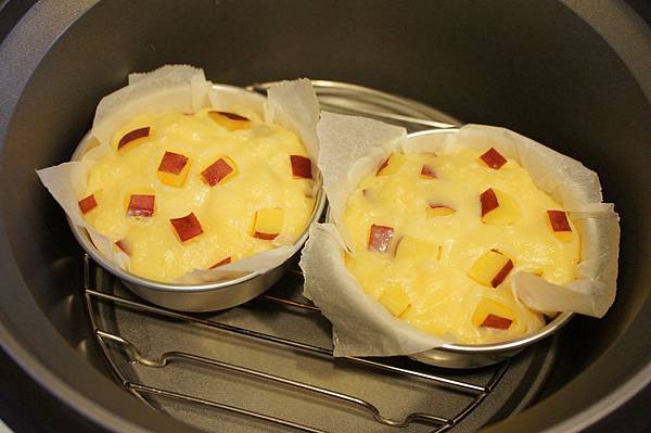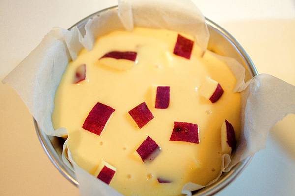 7. 再將麵糊倒入烤皿,並將保留下來的地瓜擺在上面裝飾