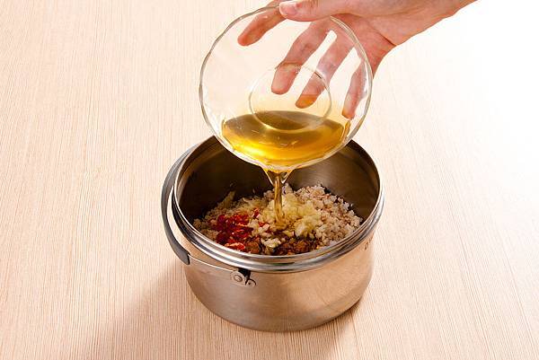 2. 拌入洋蔥、薑末、蒜末、辣椒、香油、高湯、調味料