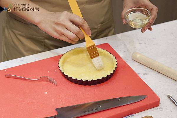 3. 將擀開之麵團鋪在模具上,按壓使麵團服貼於派盤。底部用叉子叉洞,並刷上蛋白,放入冷凍庫備用。