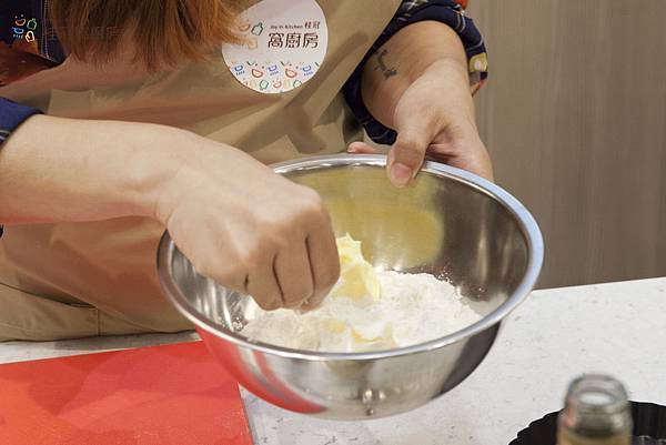 1. 將麵粉、奶油丁、鹽放入鋼碗,以手指搓捏成大小不一的粒狀;打入一顆全蛋使之融合成麵糰。