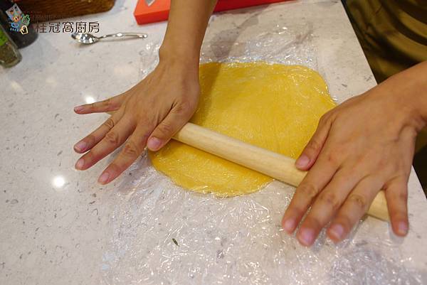 2. 將麵團鋪開擀平約0.3公分厚度,直徑約大於模具3公分之大圓。
