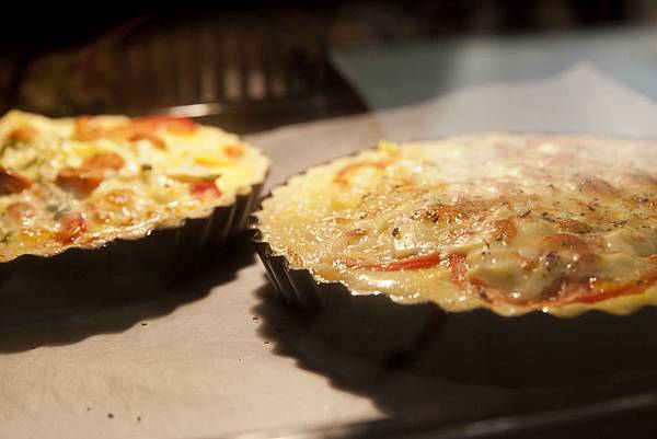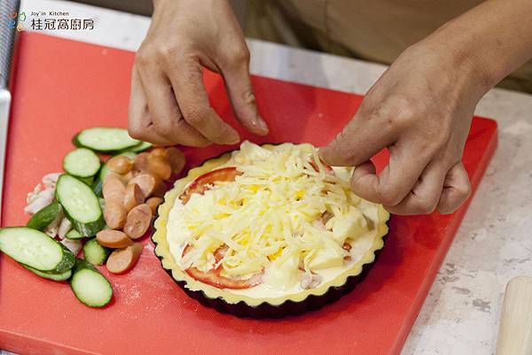 6. 將奶蛋醬倒入派盤中約九分滿,並撒上起司絲。