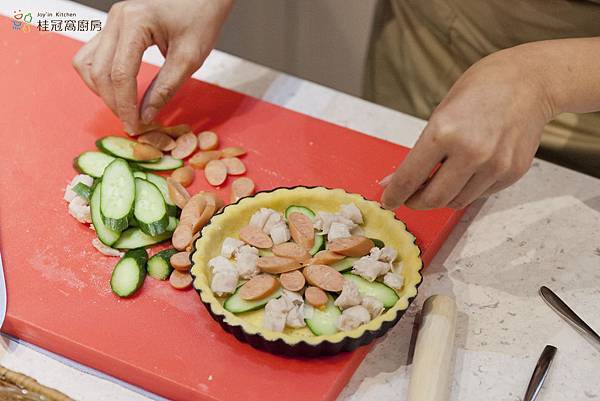 5. 將桂冠德式起司香腸、小黃瓜切片,桂冠香菇餃切丁,鋪進冷凍後已固型的派盤內。