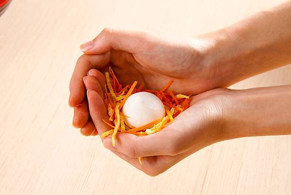 1. 雞蛋皮絲與紅蘿蔔絲加入太白粉抓勻,再輕輕包住湯圓,做成丸子狀。