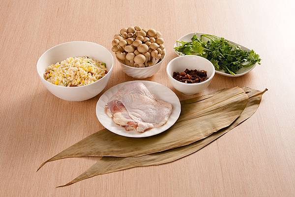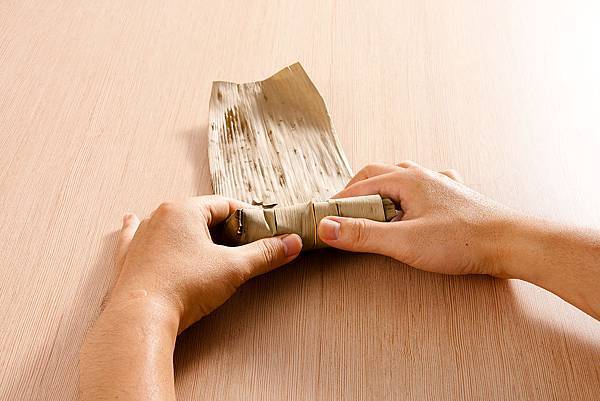 2. 竹葉洗淨取2片排十字,放入雞丁和飯料後捲起包好。