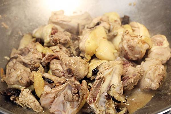 3. 同鍋放入雞肉拌炒,至肉色變白後加入米酒,再放入香菇絲繼續拌炒至香氣出來。