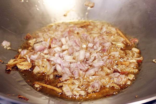 2. 起油鍋放入適量麻油,用小火爆香薑絲跟紅蔥頭,至兩者皆金黃後撈出備用。