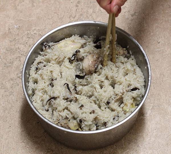 放入電鍋煮雞肉飯的好處是不會產生鍋粑,也不會因為拌炒不均而造成米粒熟成不一,而放入電鍋前用筷子將雞肉飯插鬆則可以讓米飯的熟成更均勻。