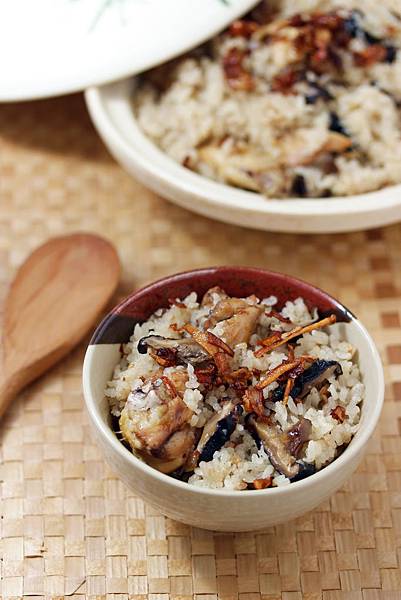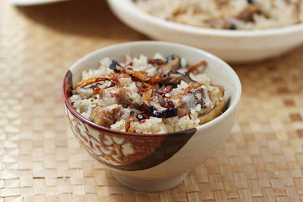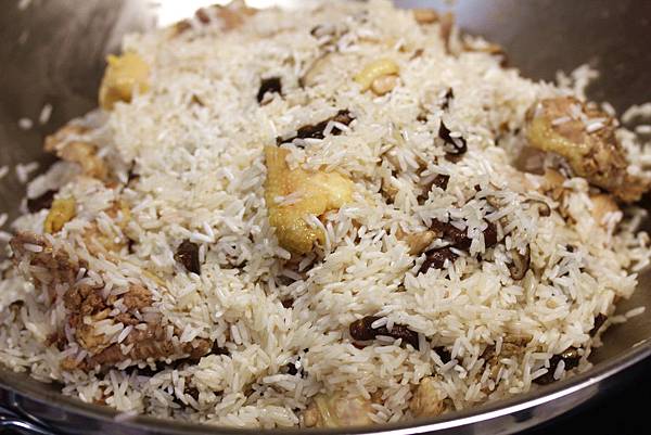 5. 把收汁的雞肉飯放入大同電鍋內鍋中,外鍋放1.5杯水,按下電源,跳起後悶5~10分鐘,拌入薑絲跟油蔥酥即完成。