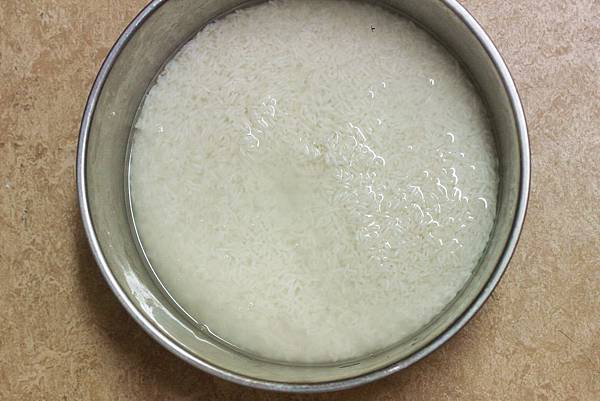 4. 放入泡好瀝乾水份的米繼續拌炒,接著加入水、香菇水、調味料拌炒到收汁。