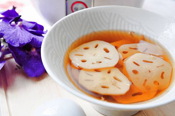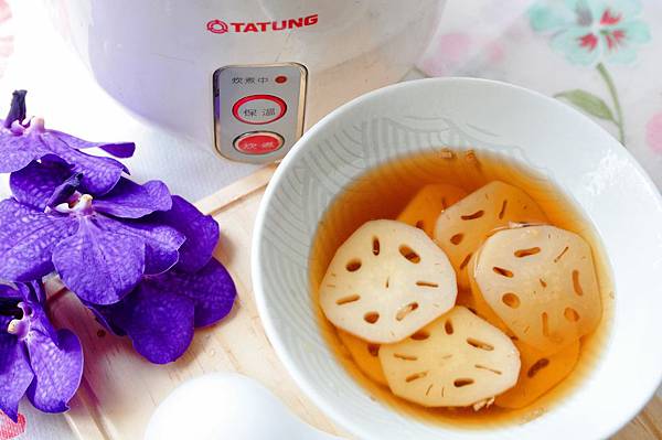 寒冷的冬天,有時會泡杯熱騰騰的薑母茶來喝~新鮮的蓮藕,折了一小段切薄片和與老薑母糖一起燉煮,好吃的暖身甜品用電鍋就能簡單做 ♥