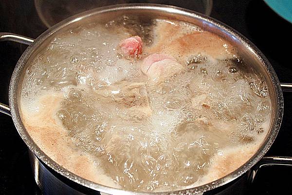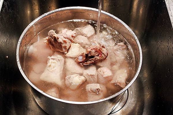 1. 羊肉切成適當大小後,煮一鍋水,將羊肉放入汆燙至浮末出來。