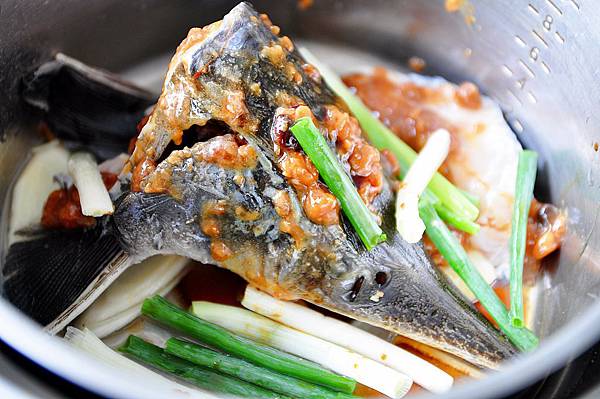 1. 將魚頭放入電鍋內鍋中,加入米酒、豆鼓味噌醬、蔥段、薑片,外鍋加入250cc的水開始燉煮。
