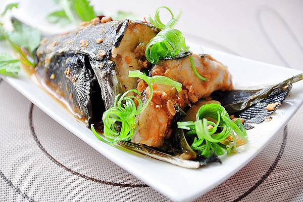 3. 將燉煮後產生的醬汁淋上魚頭,灑點胡椒粉,並擺上蔥絲與香菜點綴,美味的魚頭就能上桌享用囉。