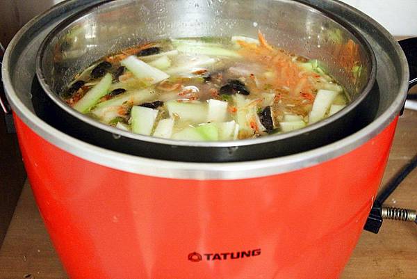 5. 將步驟4放入大同電鍋中,外鍋加1.5杯水後按下電源,待電源跳起悶3-5分鐘即可起鍋。起鍋前加入適量調味料、淋上香油再撒上香菜或芹菜末提味即可。