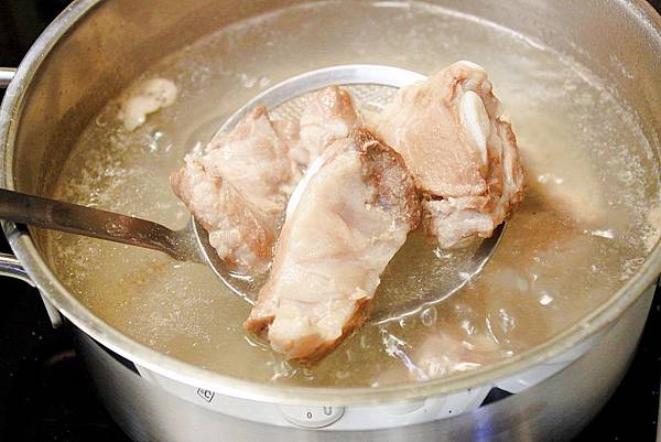 1. 起一鍋滾水,將排骨放入汆燙去血水備用,燙排骨的同時洗淨白米備用。