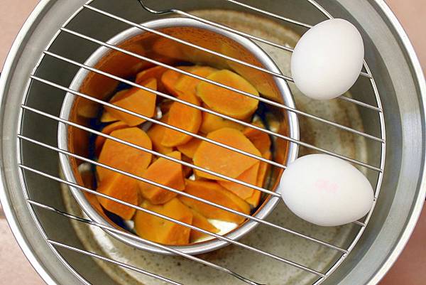 1.地瓜切塊放入內鍋中,雞蛋放在網架上,一起放入大同電鍋中蒸熟