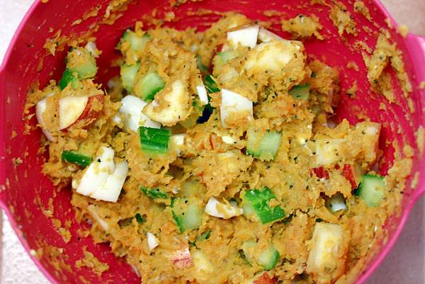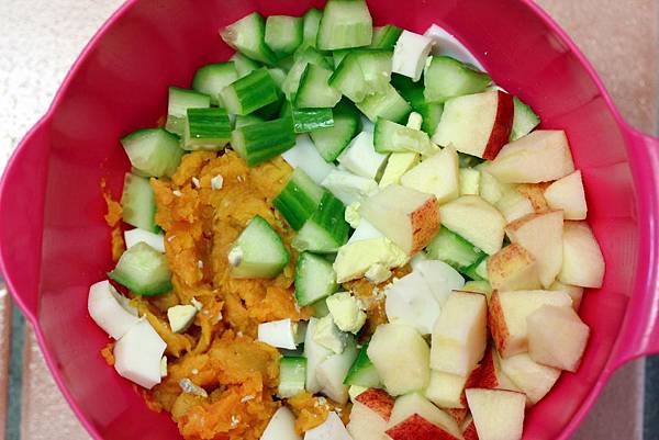 2.地瓜搗成泥、雞蛋剝殼切丁、小黃瓜切丁、蘋果切丁