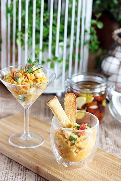 3.加入調味料攪拌均勻後,將土司切條烤香(或法式棍麵包切片),即可佐地瓜蛋沙拉享用