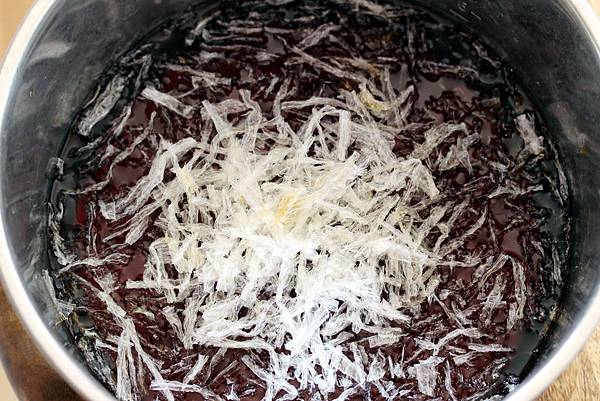 1.大同電鍋內鍋先放入冬瓜茶,接著把剪小段的洋菜絲放入浸泡約20-30分鐘