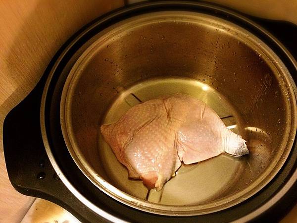 2.薑片鋪在內鍋底,將去骨雞腿排放入電鍋內鍋,加入酒,蓋上內蓋,鍋外放1米杯水,蒸至完成取出放涼。