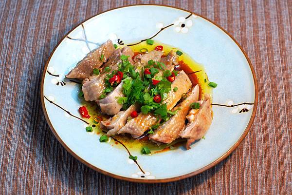 3.調好醬料後,將放涼的雞腿排切好,淋入醬料,撒上蔥花、香菜、紅辣椒,即可上桌。