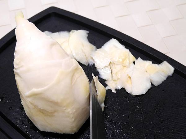 4.剝除筍殼,再用刀削除底部和下端的粗纖維,隨意切成滾刀狀後,擺進密封盒,放進冰箱冷藏即可。(冷藏過的筍肉會更加清甜)冷藏過後的綠竹筍,隨意擠上滿滿的美乃滋,也可試試另類新吃法,沾食柴魚醬油+綠芥末(山葵)。