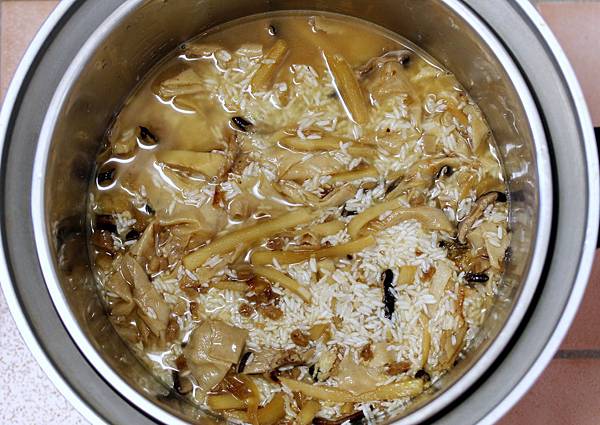 5.接著外鍋放1.2杯水,按下電源,跳起後再加0.2米杯的水再按一次,跳起後悶5-8分鐘,即可搭配香菜及甜辣醬享用。