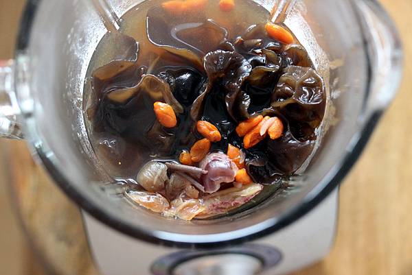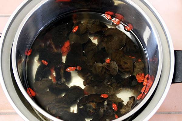 2.把泡開的黑木耳、黑棗、枸杞、桂圓及水一起放入大同電鍋的內鍋中,外鍋放1杯水,按下電源,跳起後加入冰糖,外鍋再放0.5杯水再按一次電源。